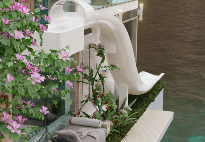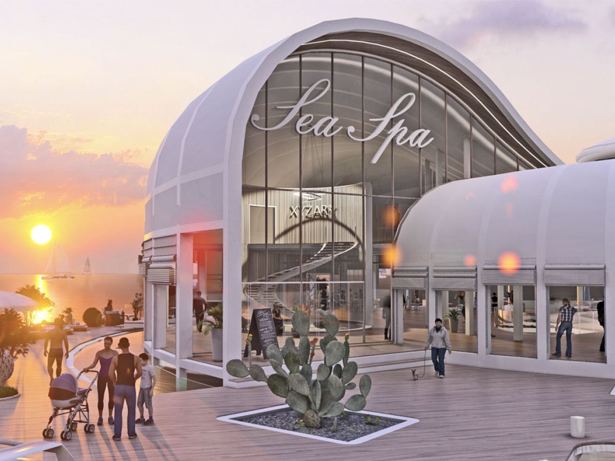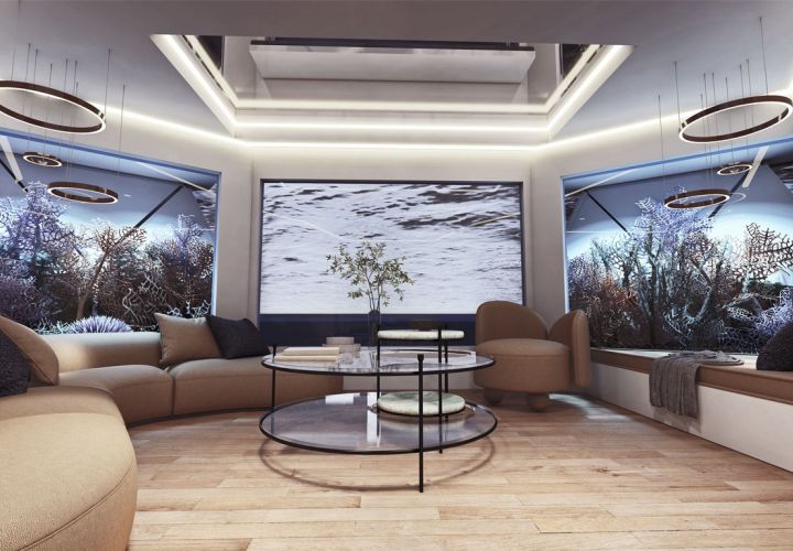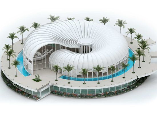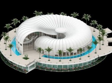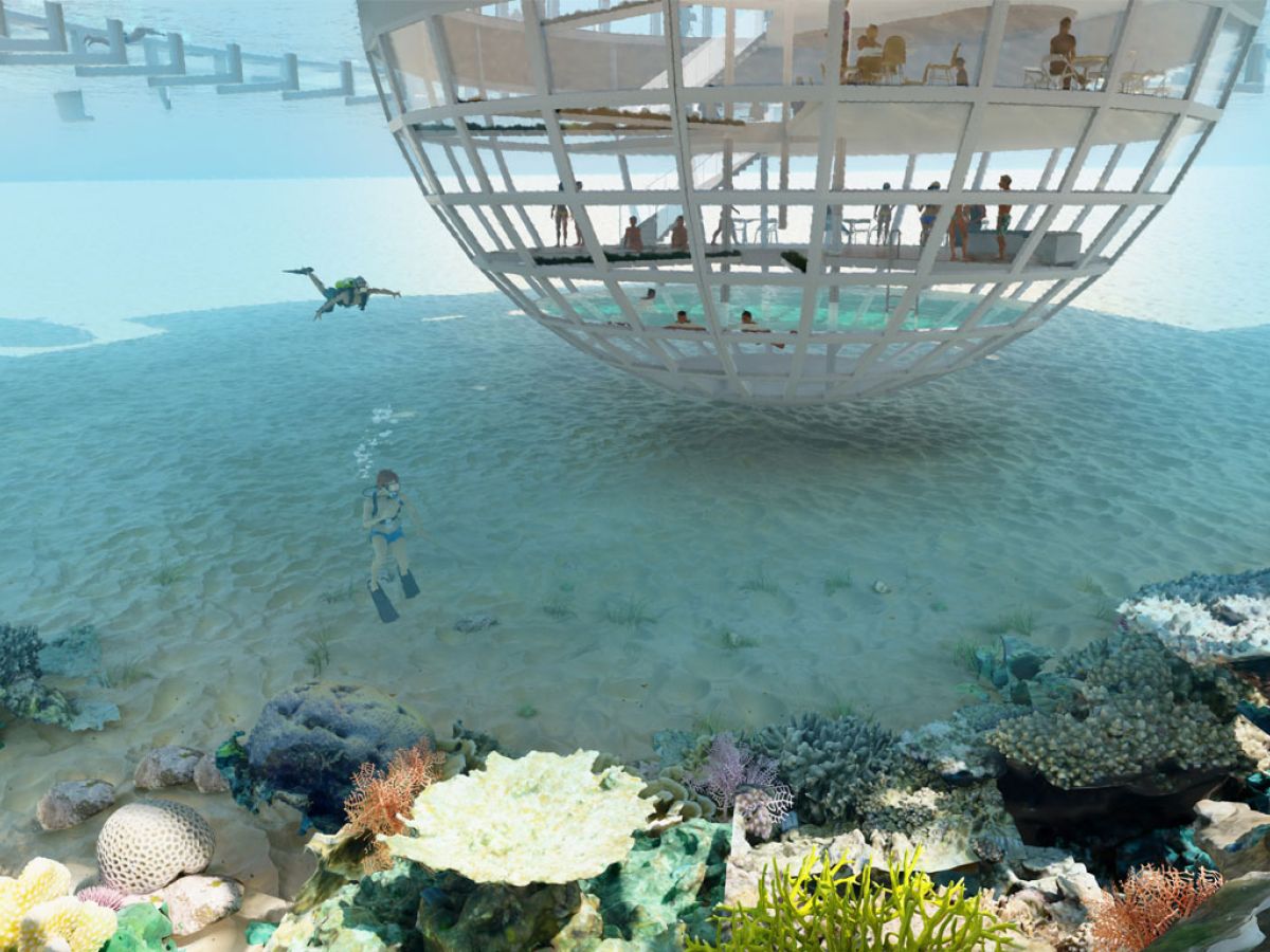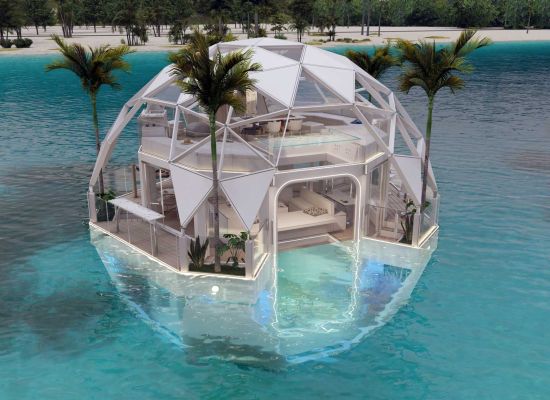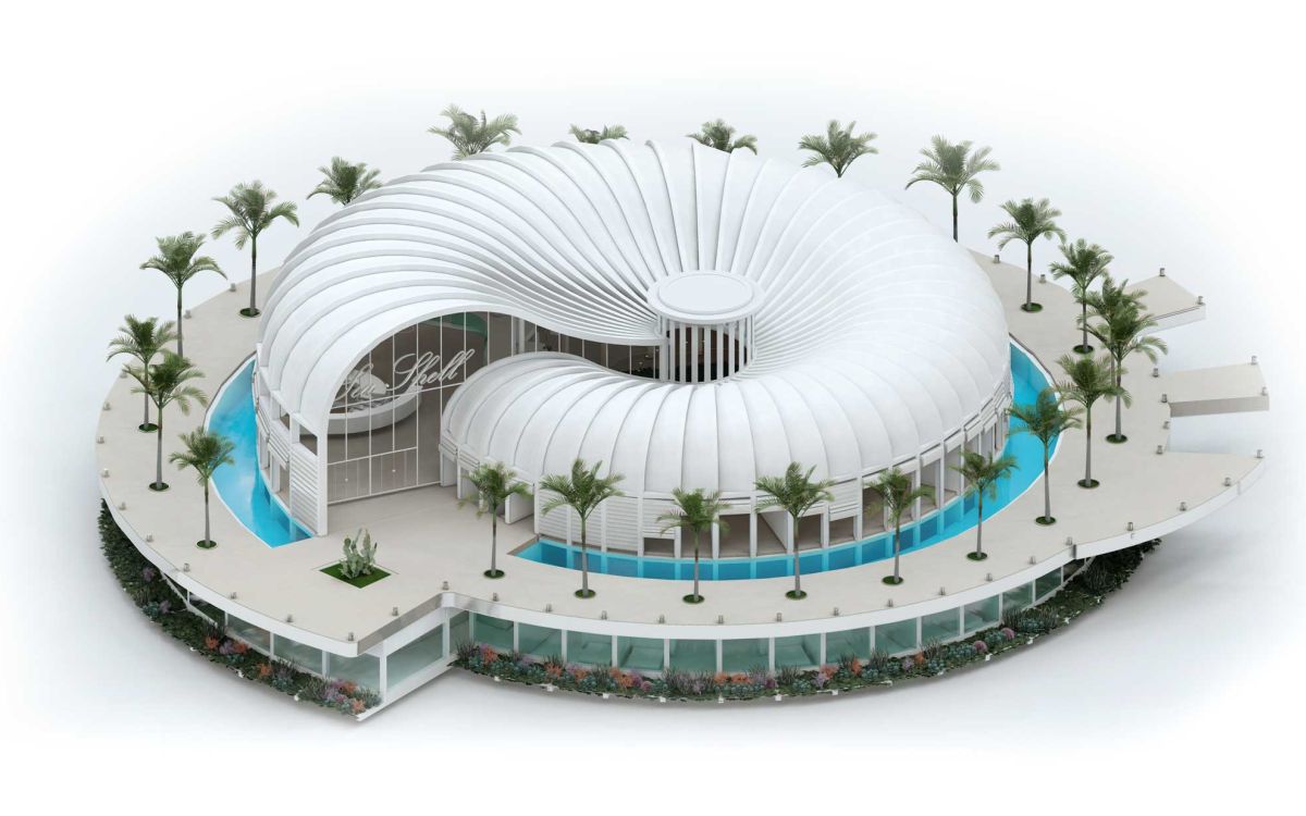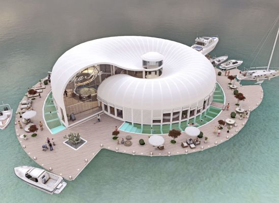 The Sea Shell floating resort is a luxurious retreat offering a one-of-a-kind on-water experience. The resort, designed with inspiration from a sea shell, is located in sheltered waters and features an underwater pool surrounded by coral reefs, submerged floors for dining or partying, and underwater rooms with views of the coral reefs.